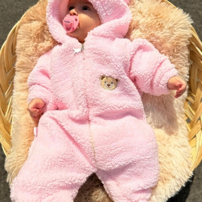 • جامبسوت شتوي قطيفي دافئ بقبعة وأذنين – تصميم دب ناعم للأطفال