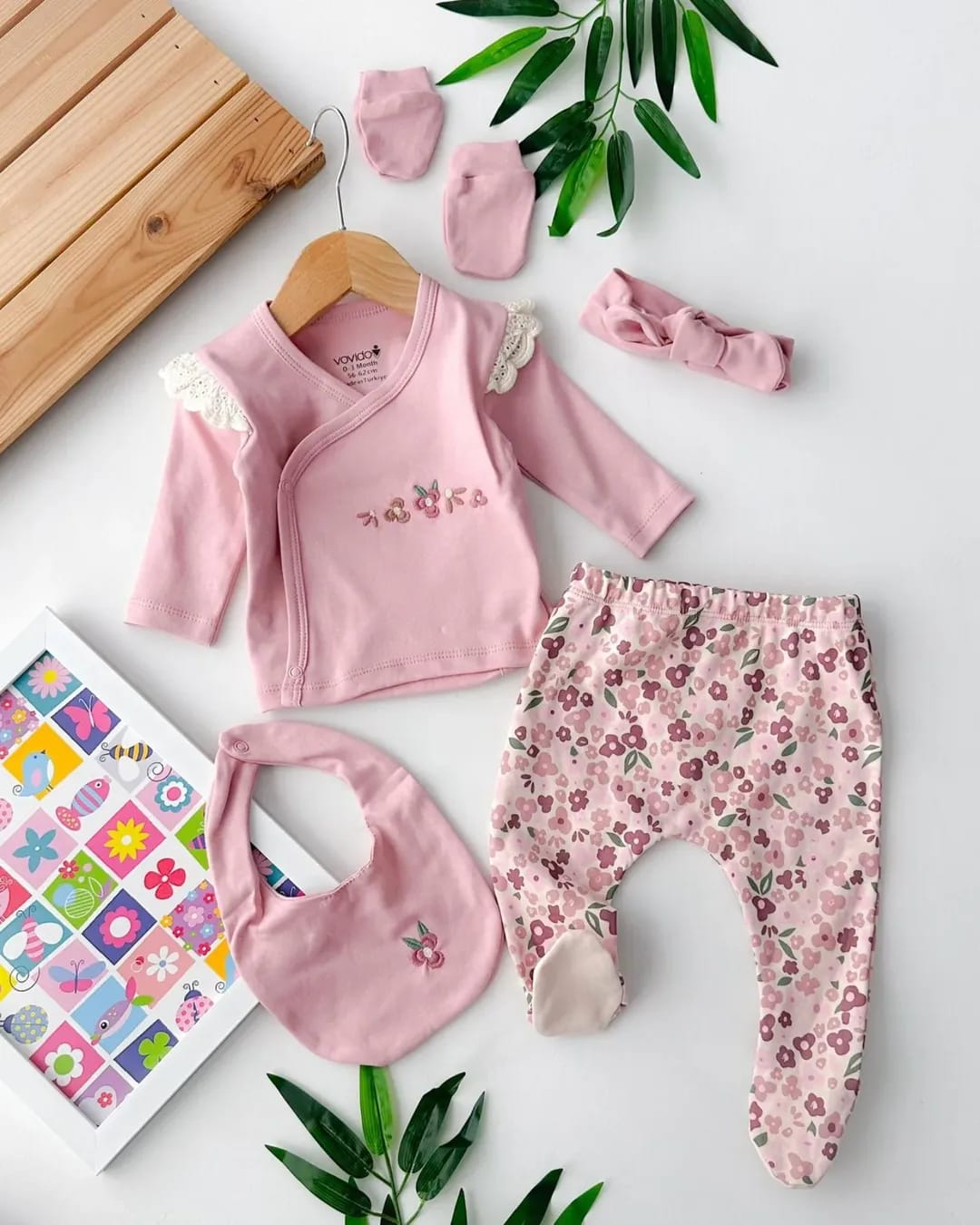 • طقم بيبي بناتي 5 قطع باللون الوردي المزهر