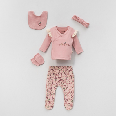 طقم بيبي بناتي 5 قطع باللون الوردي المزهر
