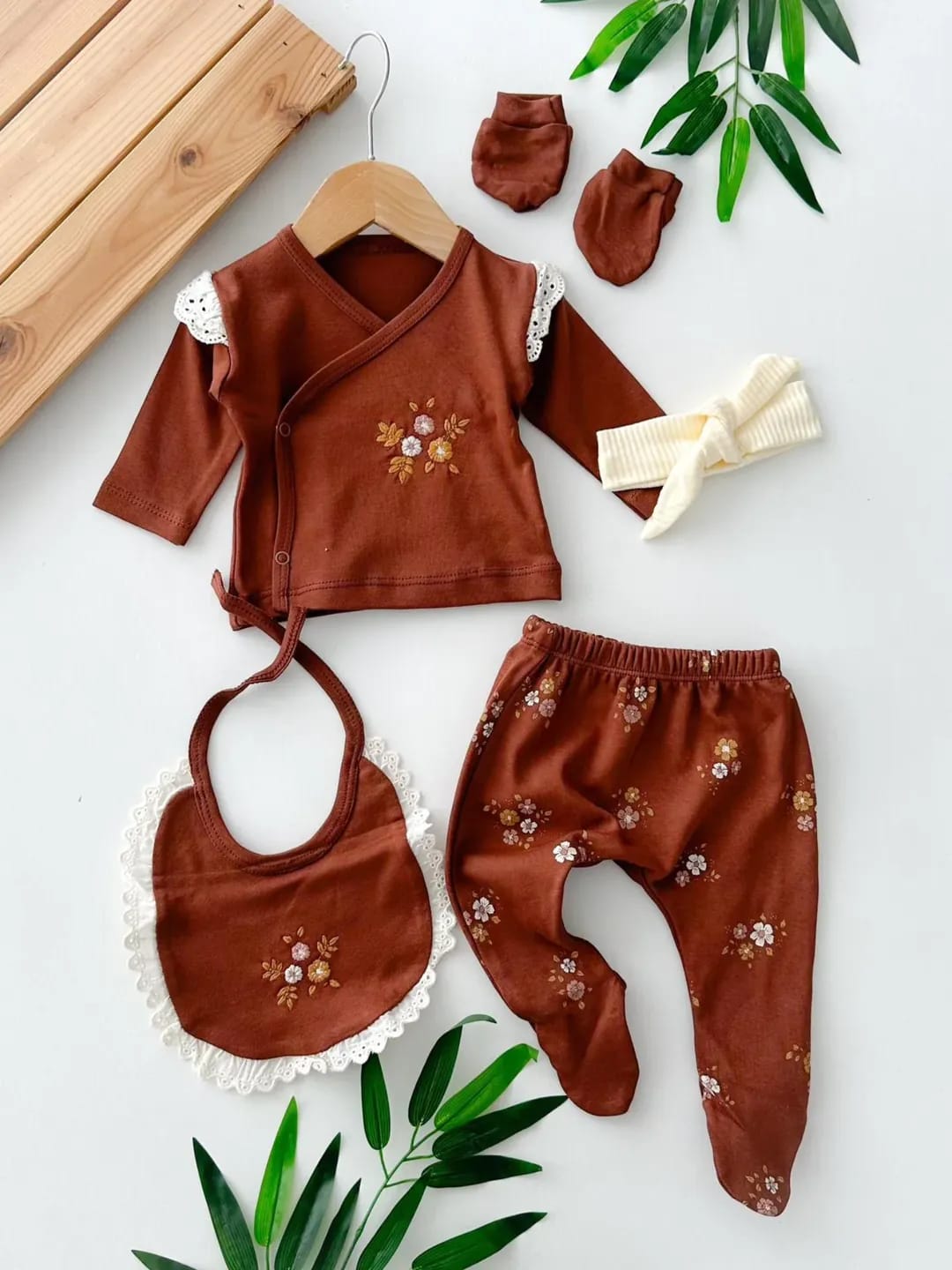 طقم بيبي بناتي 5 قطع باللون البني المزهر طقم بيبي بناتي 5 قطع باللون البني المزهر