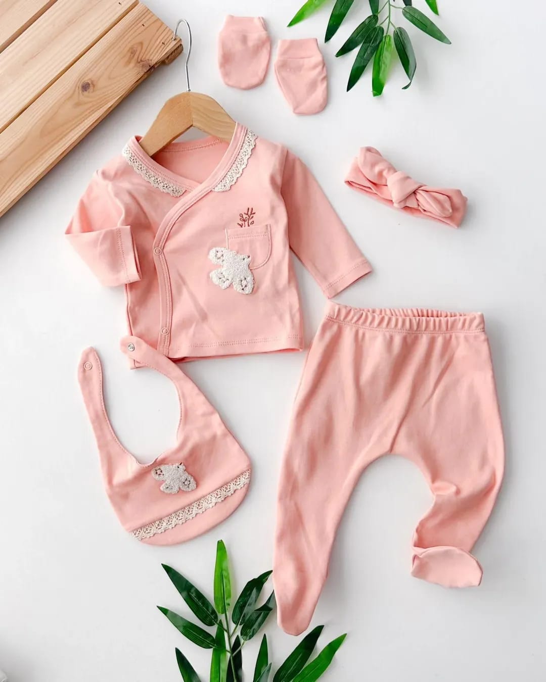 طقم بيبي بناتي 5 قطع باللون الوردي والسومون المزين بنورس