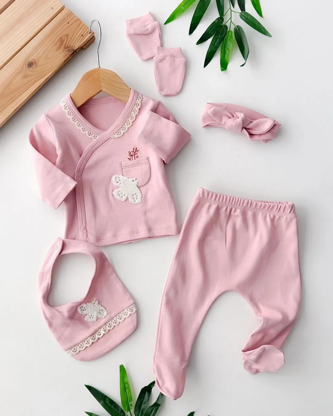 طقم بيبي بناتي 5 قطع باللون الوردي الفاتح مع قبعة دانتيل