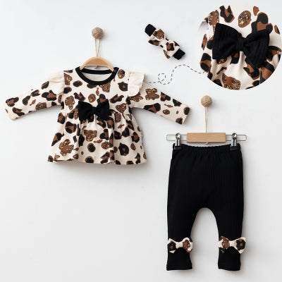 • طقم بناتي من ثلاث قطع بنقشة الفهد وشرائط أنيقة