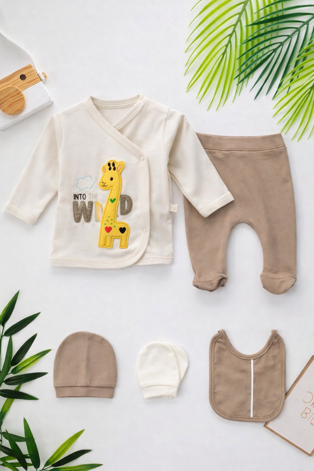 • طقم مواليد أنيق ومتكامل 5 قطع بتصميم الزرافة اللطيف