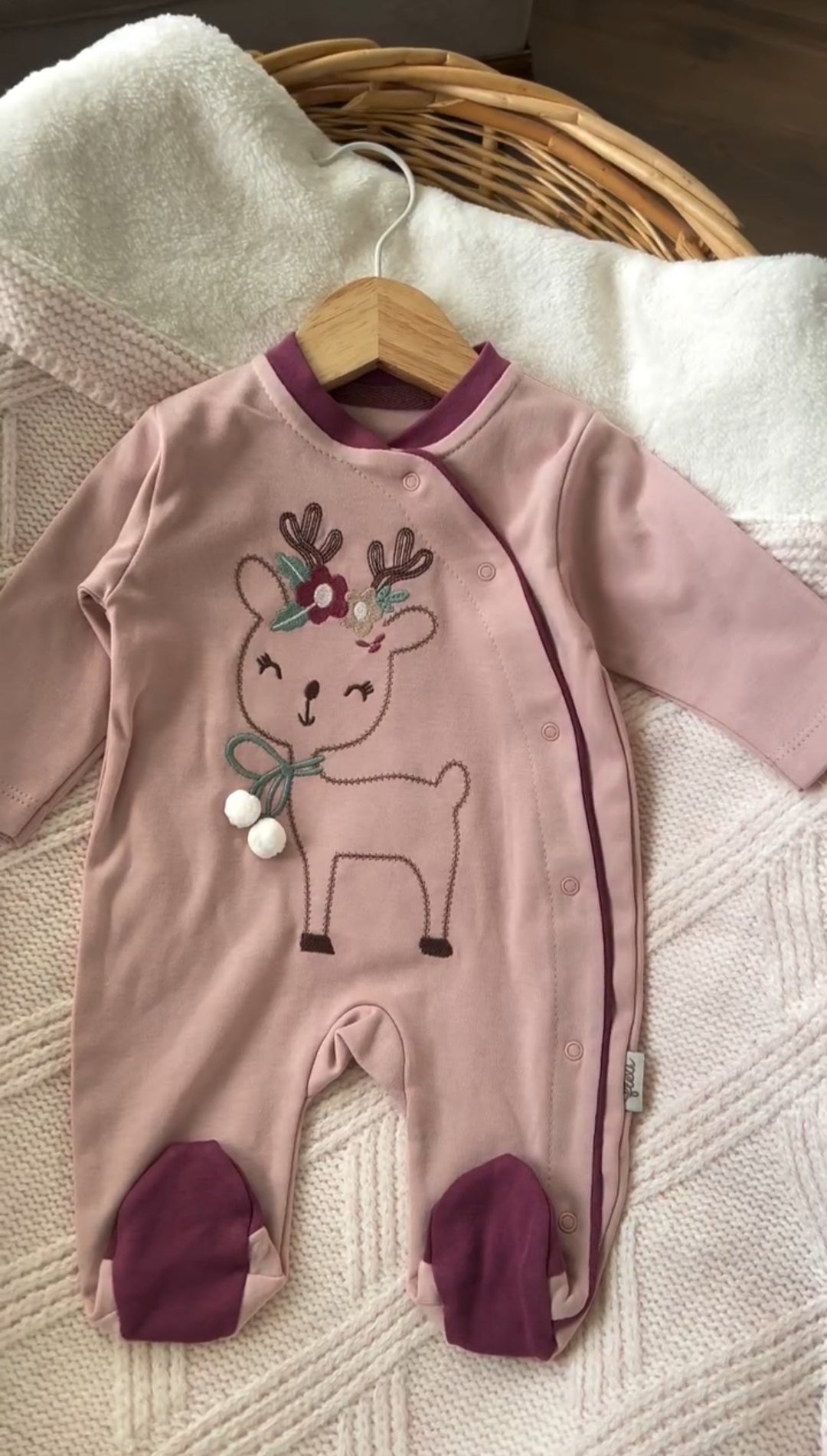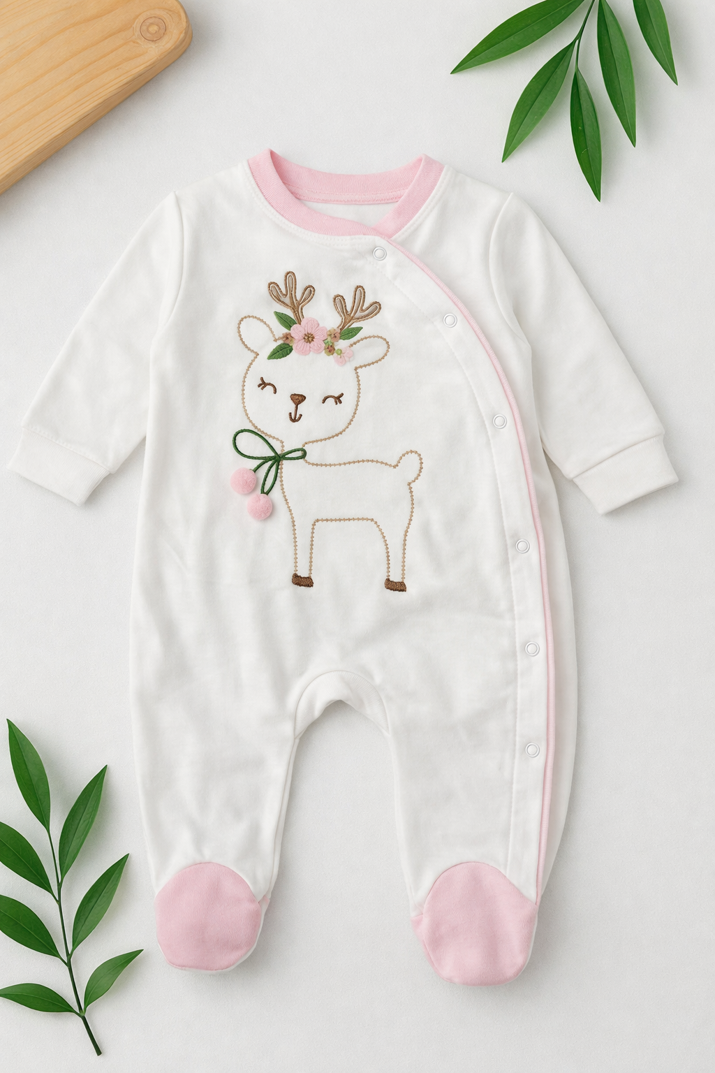 • جامبسوت قطني ناعم بتطريز غزال لطيف – تصميم مريح للمولود الجديد