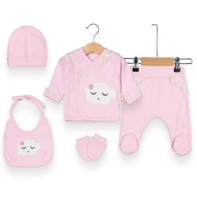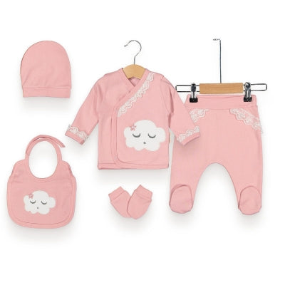 طقم بيبي بناتي 5 قطع باللون الوردي والسومون المزين بنورس