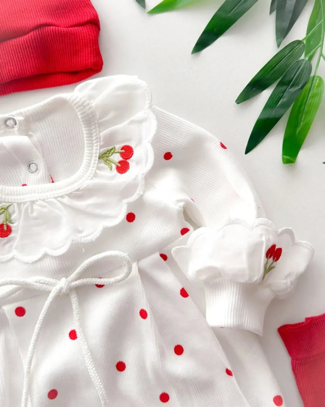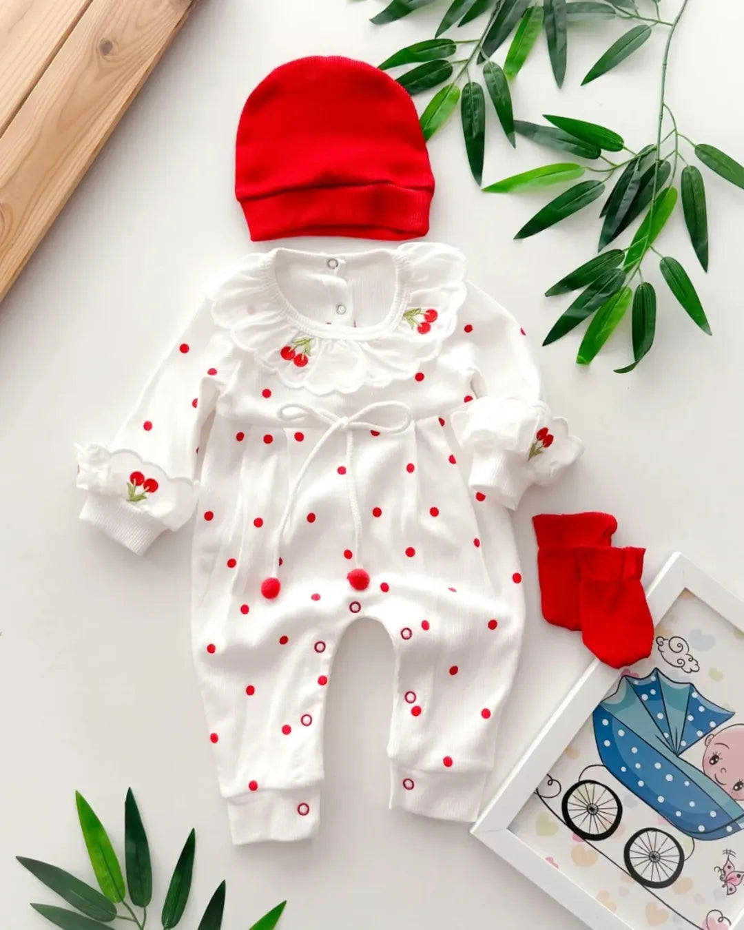 • سالوبيت بنات بتصميم كرز أنيق 🍒 مع قبعة وقفازات – ناعم ومريح